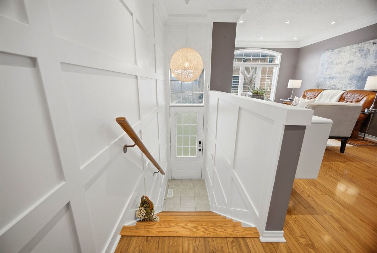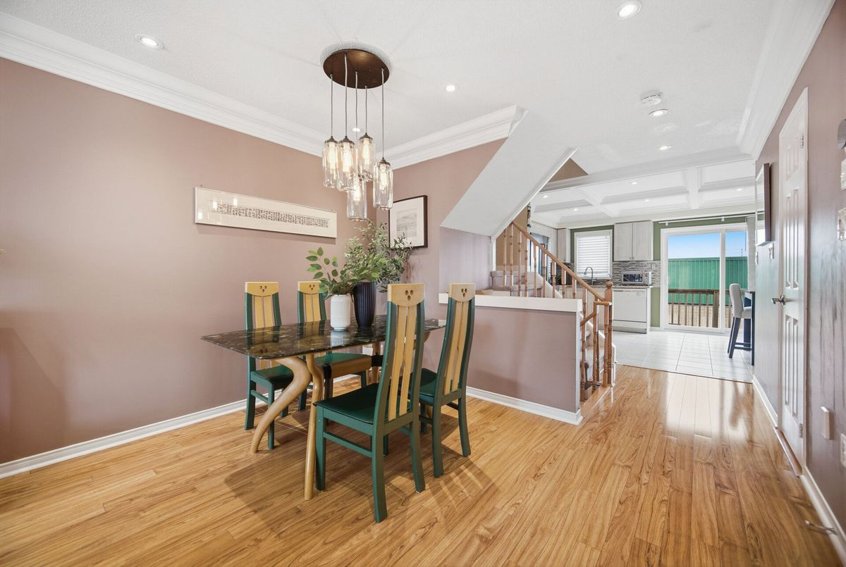 Beautifully maintained and filled with natural light, this southeast-facing townhome offers a warm, inviting atmosphere and a layout that feels both functional and easy to live in. From the moment you step inside, the foyer sets the tone with its dramatic 13-foot ceiling, panelled walls, pot lights, and statement chandelier. The main level is bright and welcoming, with an open-concept living and dining area featuring laminate floors, crown moulding, pot lights, and a striking palladium window that draws in the light. It is a space that feels comfortable for everyday living and polished enough for entertaining.The updated kitchen and breakfast area blend style and practicality with a coffered ceiling with pot lights, stainless steel appliances, and a walkout to the balcony. A main floor powder room adds extra convenience and is finished with a pedestal sink, crown moulding, and pot lights.Upstairs, the primary bedroom offers a comfortable retreat with pot lights, a window seat, walk-in closet, and a private 3-piece ensuite with granite counters. Two additional bedrooms provide flexible space for family, guests, or a home office, each with generous closet space and large windows. The main bathroom is spacious and well finished with granite counters, ceramic floors, and pot lights.The ground level adds valuable living space with a bright family room featuring laminate flooring, crown moulding, pot lights, and a walkout to the large deck and fully fenced yard with mature landscaping and a small shed. Interior garage access, a double coat closet, and generous storage add to the home's practical appeal. Located close to visitor parking and near a park, and set close to top-rated schools, Erin Mills Town Centre, Churchill Meadows Community Centre, skatepark, Meadowvale Tennis Club, Credit Valley Hospital, major highways, and Streetsville and Meadowvale GO Stations.this home offers the kind of everyday convenience buyers appreciate.
